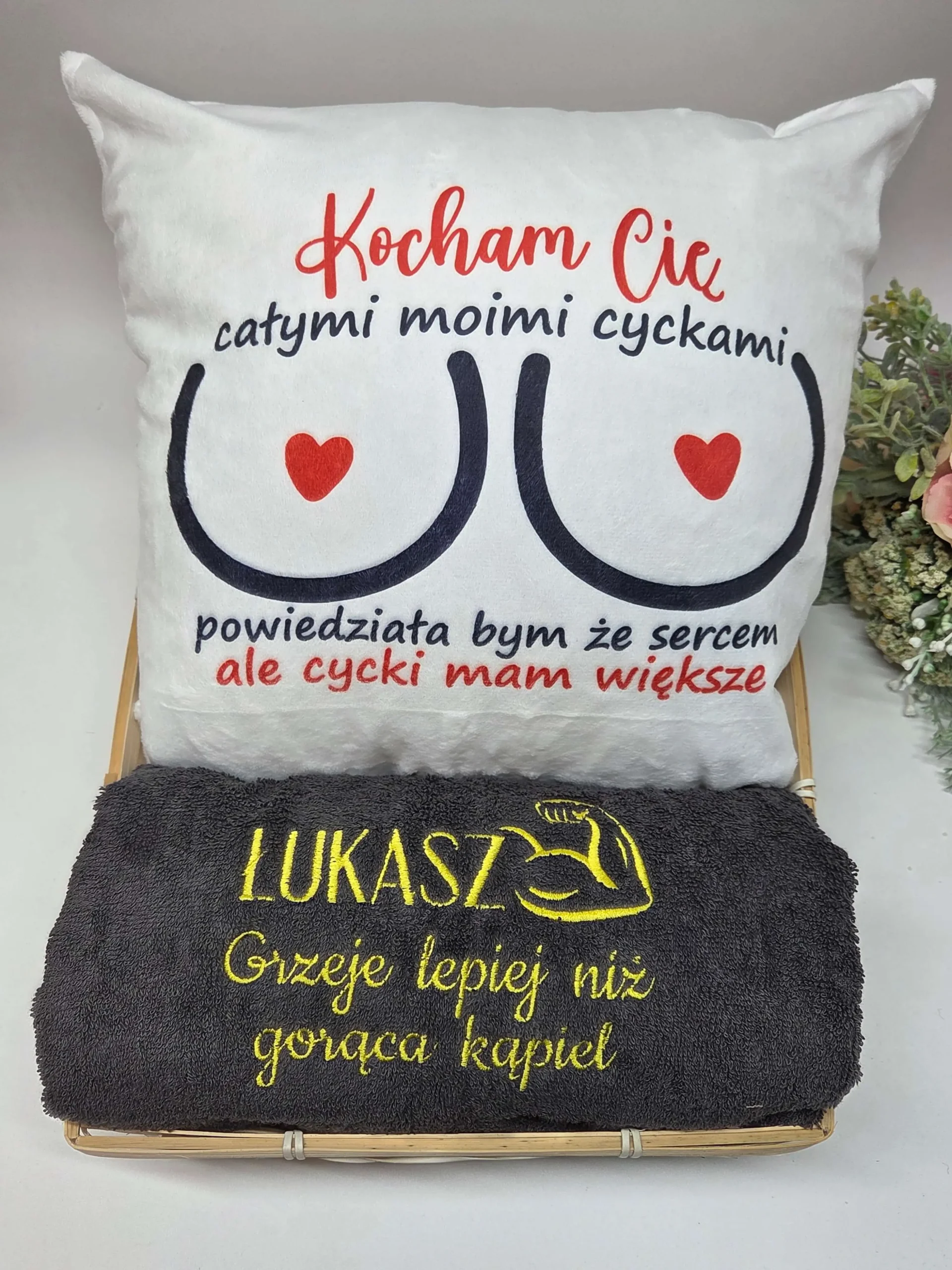 Zestaw składa się z ręcznika kąpielowego z haftem oraz dekoracyjnej poduszki z nadrukiem, dzięki czemu sprawdzi się jako oryginalny i praktyczny prezent walentynkowy.