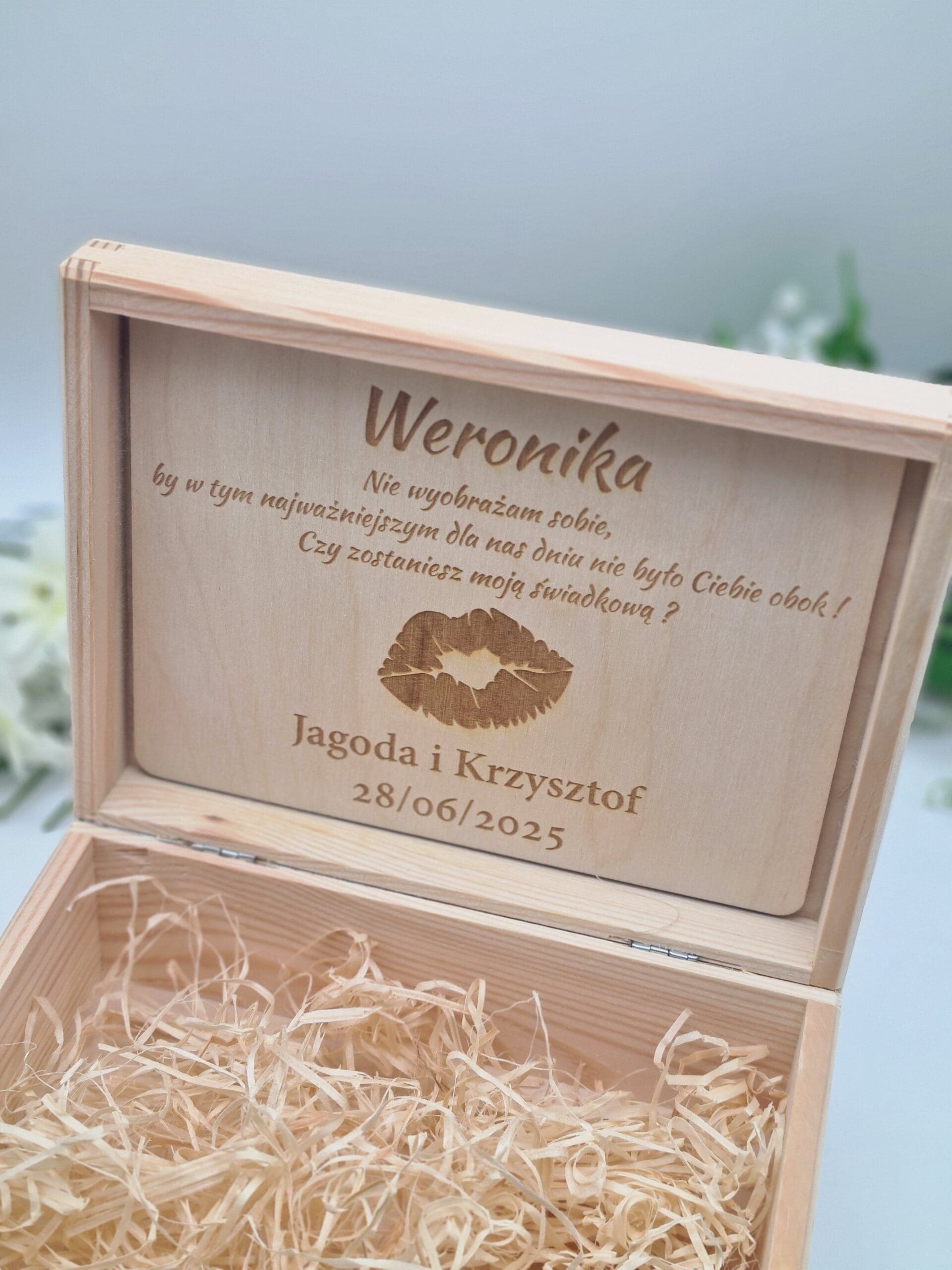 Nasza personalizowana skrzynka to idealny prezent dla przyszłej świadkowej. Sentymentalny napis spowoduje wzruszenie i cudowne emocje w jej sercu.