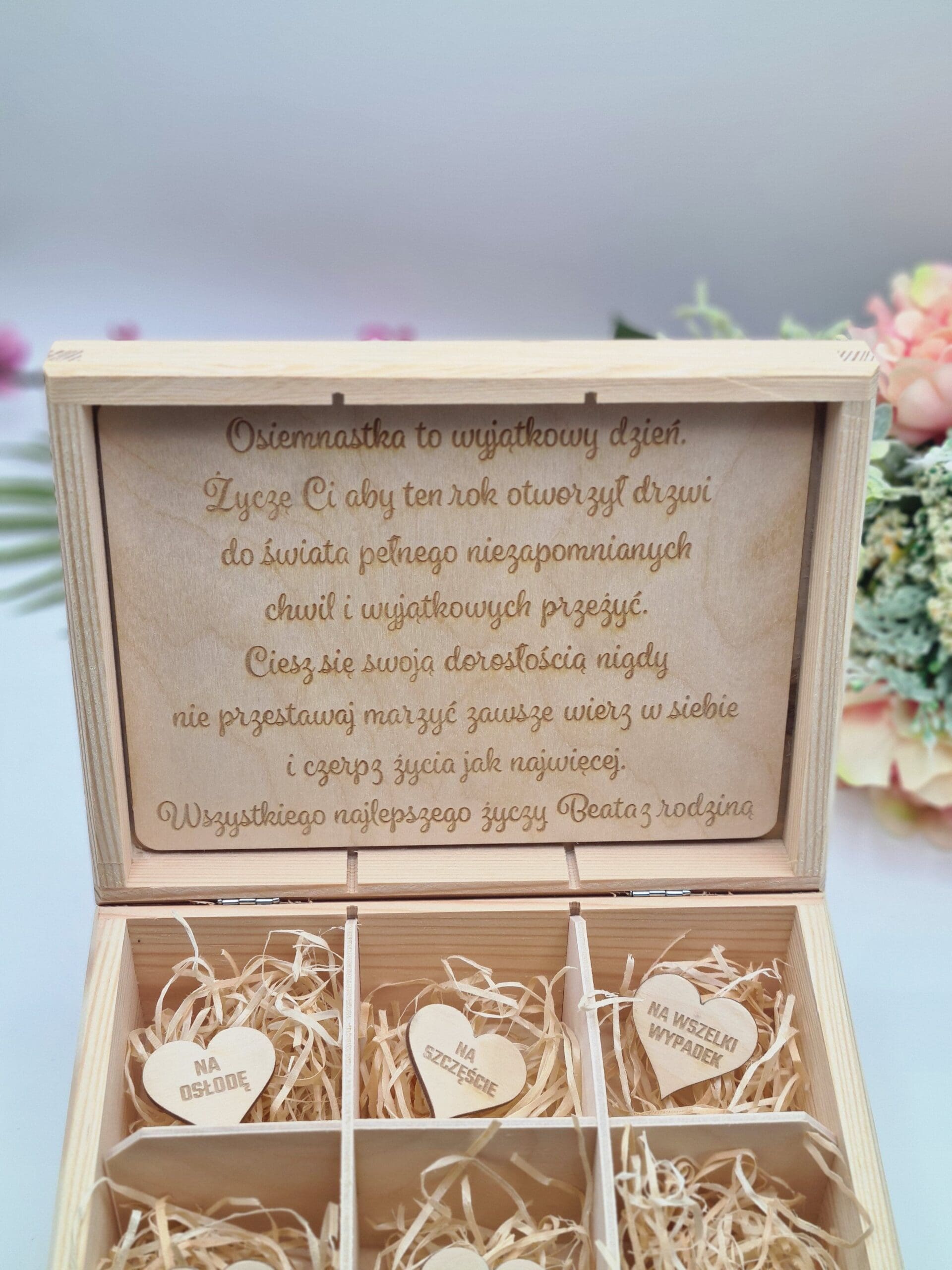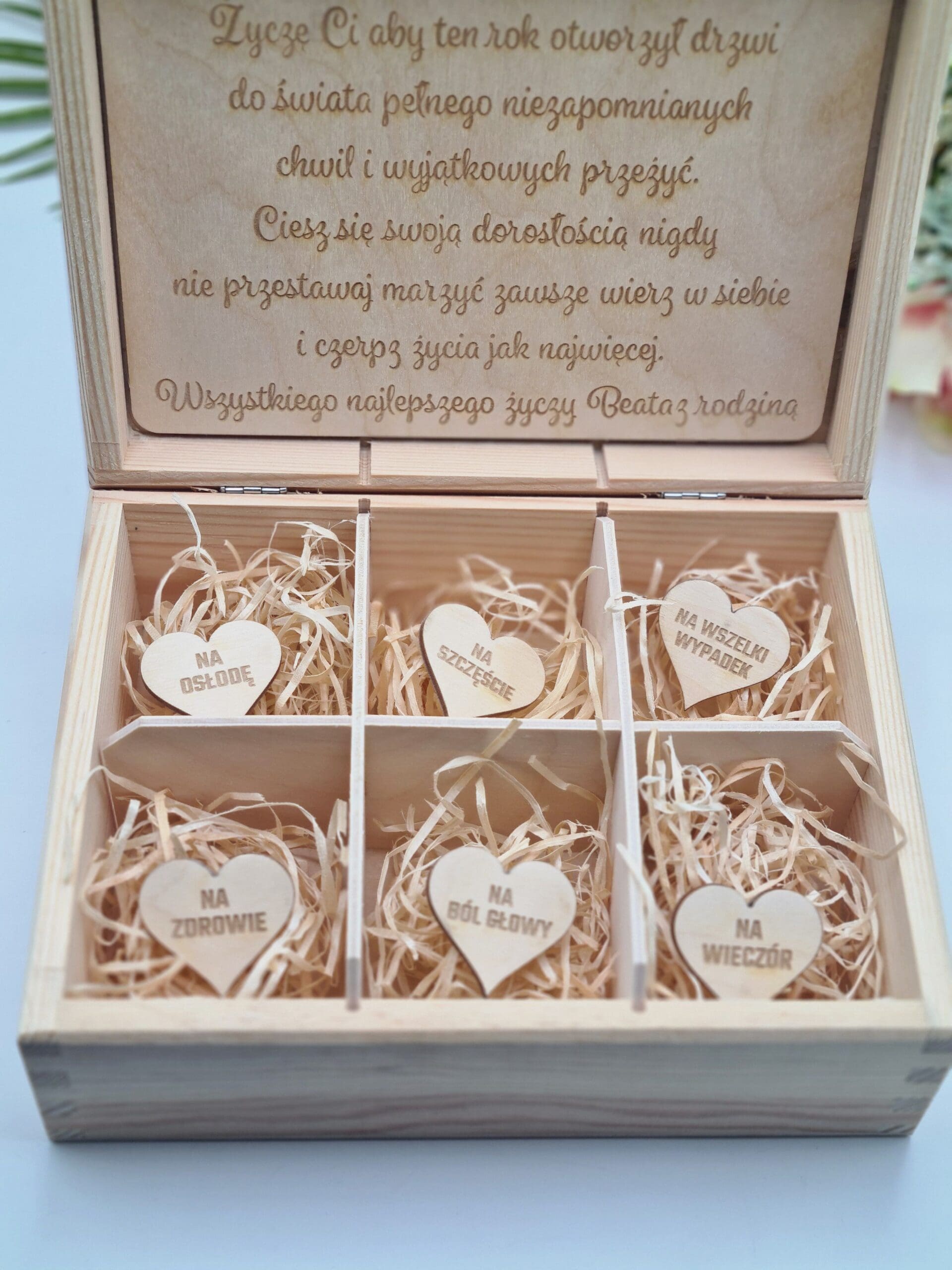 Skrzynka jest w całości drewniana, ma 6 przegródek w środku oraz serduszka z odpowiednimi tekstami, które pomogą uzupełnić skrzyneczke w odpoiesni sposób.