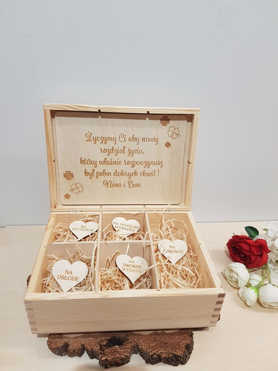Skrzynka jest w całości drewniana, ma 5 przegródek w środku oraz serduszka z odpowiednimi tekstami, które pomogą uzupełnić skrzyneczke w odpoiesni sposób.