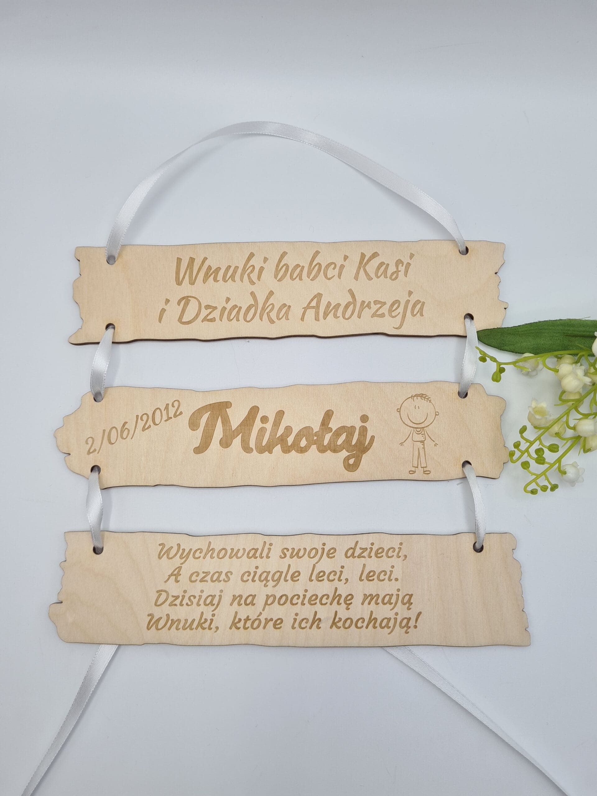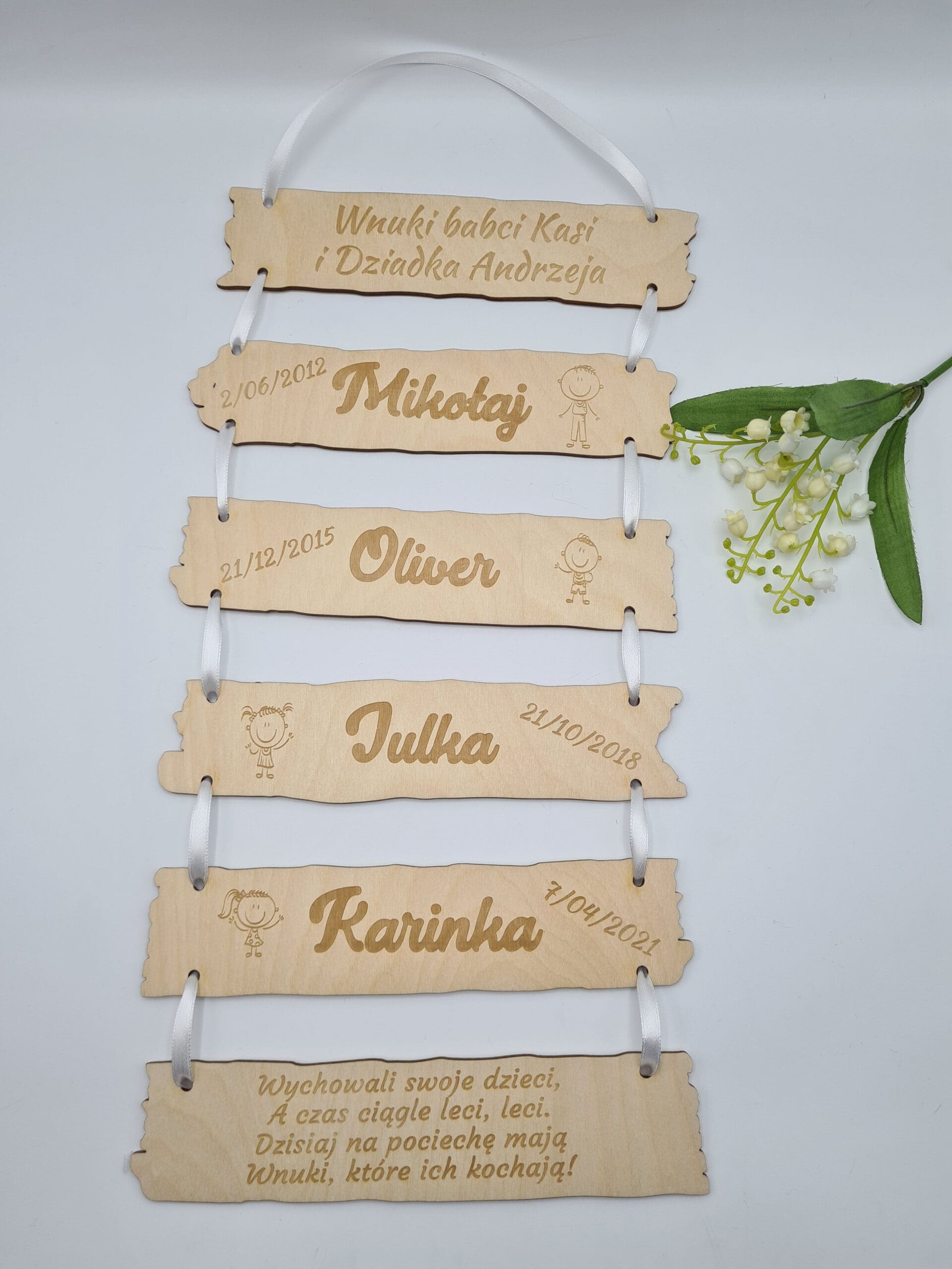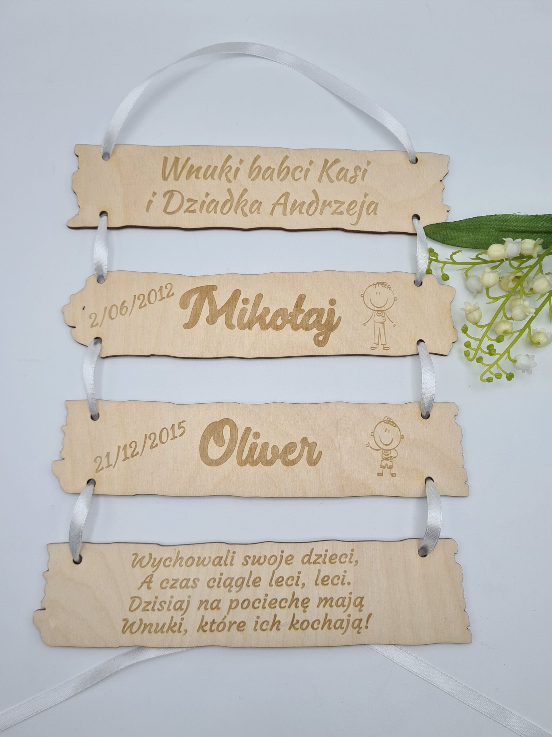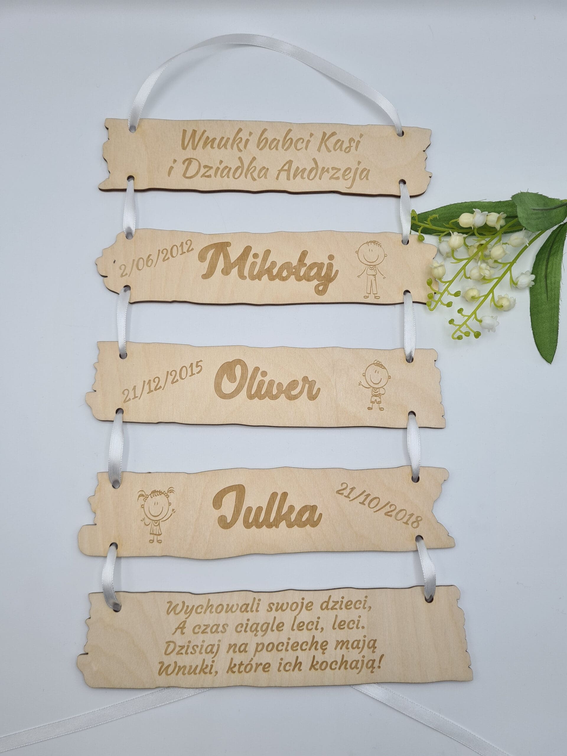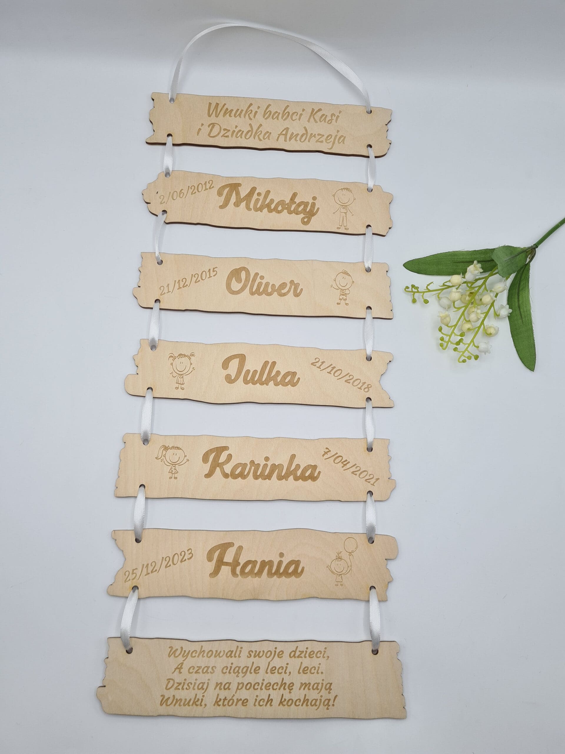 Tabliczki w środku wykonane z imionami wnuków, datą urodzenia oraz grafiką (grafiki do wyboru na zdjeciu) – JEDEN WNUK NA JEDNEJ TABLICZCE.
