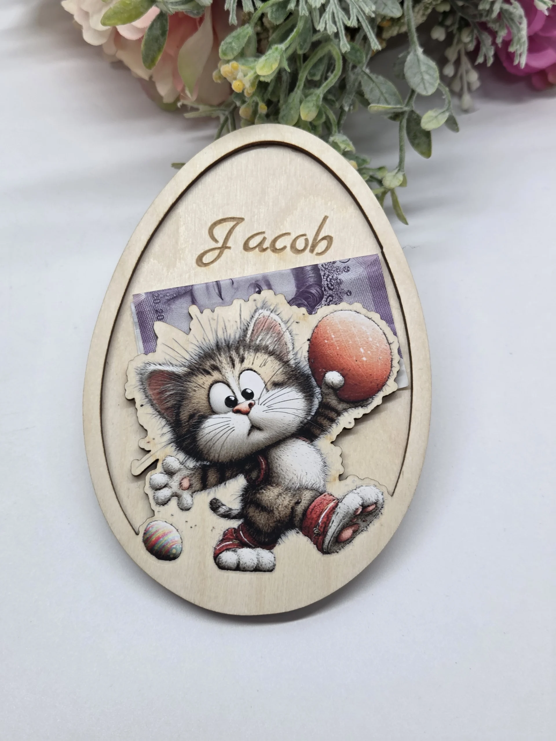 Jajko zostało wykonane z naturalnego drewna i posiada specjalne miejsce na banknot, dzięki czemu możesz wręczyć dziecku pieniądze w znacznie bardziej kreatywny i elegancki sposób niż w zwykłej kopercie. Personalizowane imię nadaje upominkowi indywidualny charakter, a kolorowa grafika z sympatycznym zajączkiem i pisankami idealnie oddaje wielkanocny klimat.