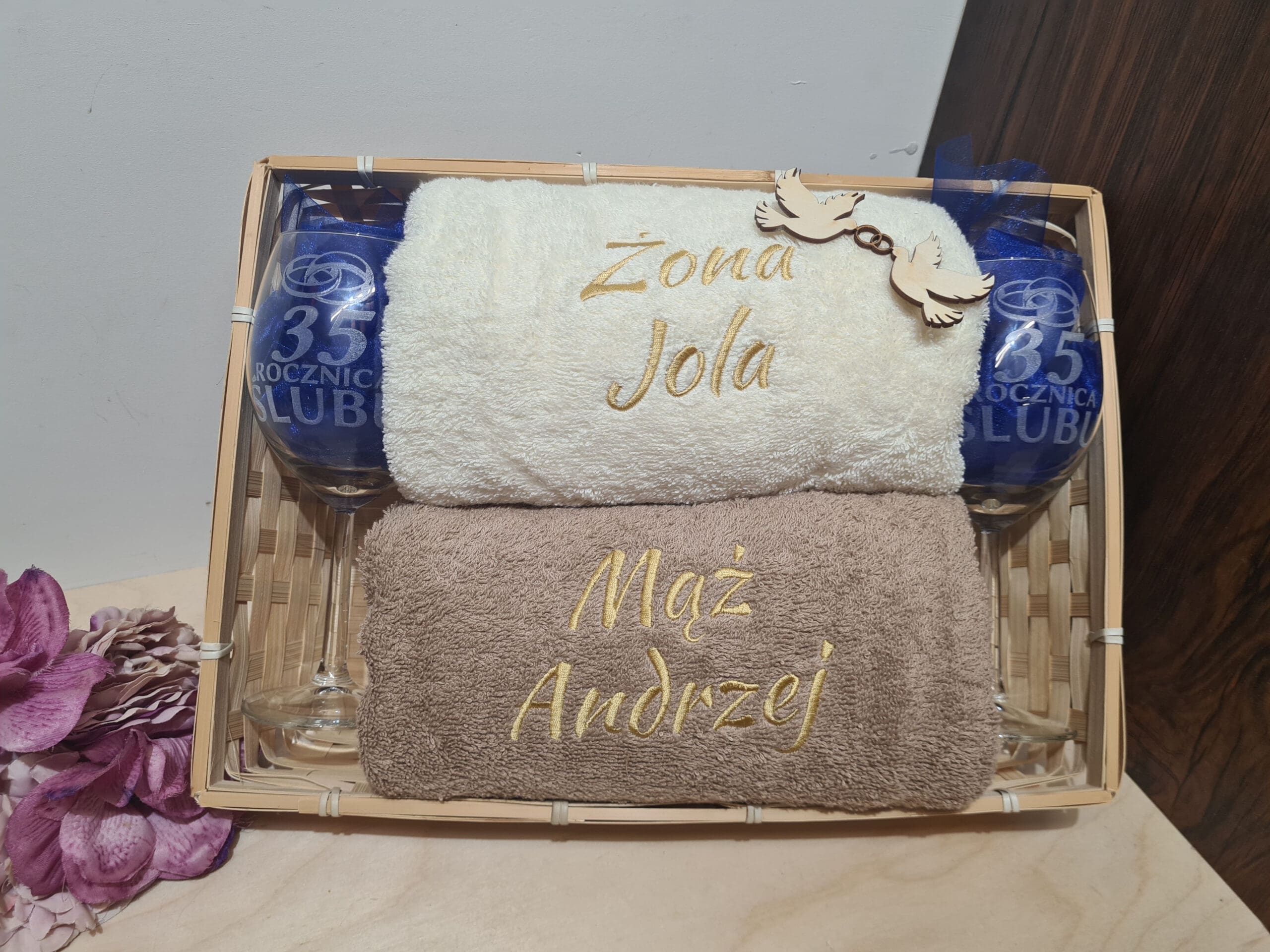 Podaruj bliskiej osobie zestaw prezentowy na rocznice ślubu i stwórz atmosferę luksusu i romantyzmu. Ten zestaw prezentowy zawiera dwa miękkie, puszyste ręczniki kąpielowe z bawełny o wymiarach 70×130 cm i gramaturze 500gsm, które zapewnią chwile relaksu niczym w SPA. Dodatkowo, w zestawie znajdziesz dwa eleganckie kieliszki do wina, idealne do wspólnego świętowania. Całość zapakowaliśmy w piękny, ozdobny koszyk, który doda uroku każdej okazji.