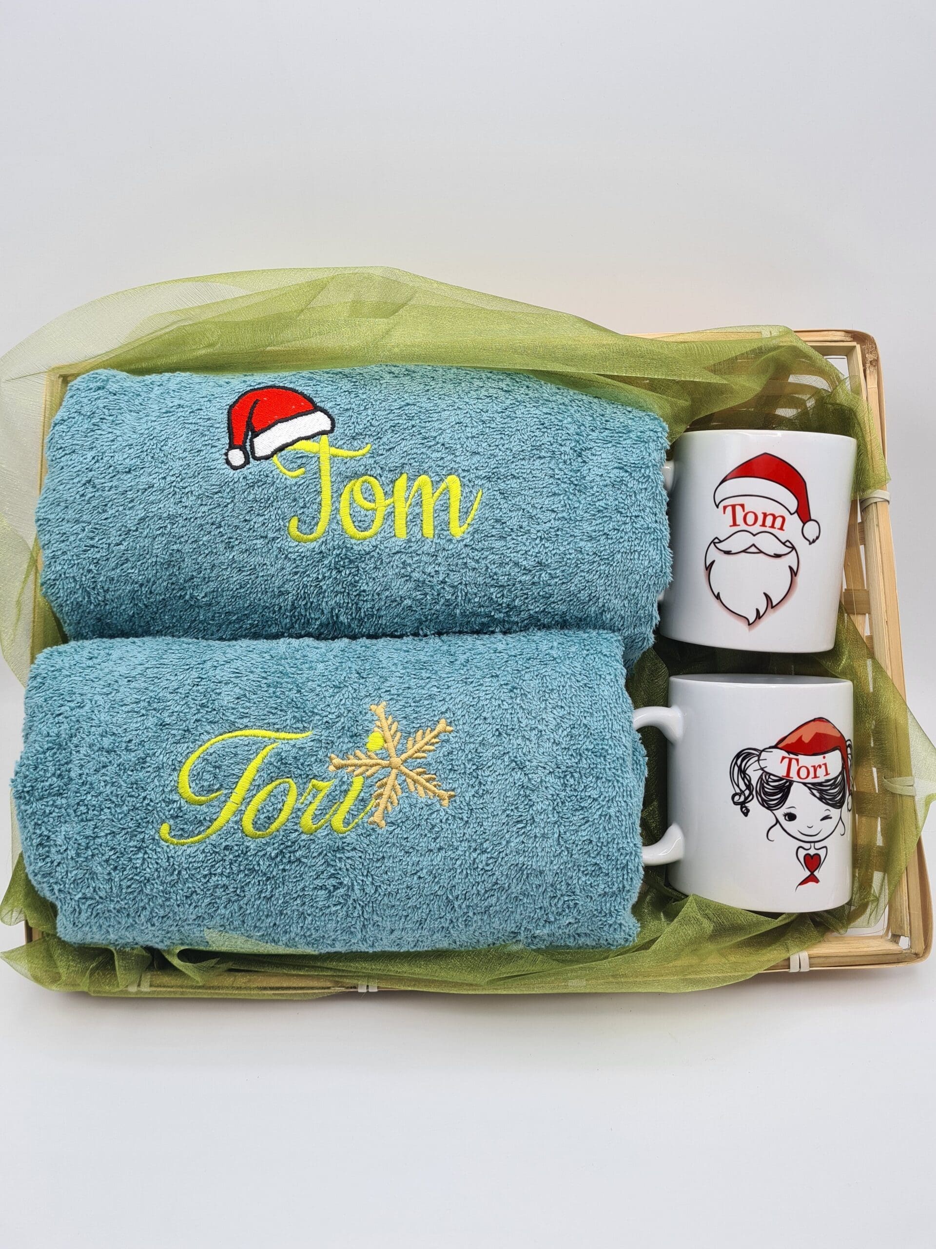 Zestaw dwóch ręczników z haftem i dwóch kubków w koszyku – Prezent na Święta dla pary
